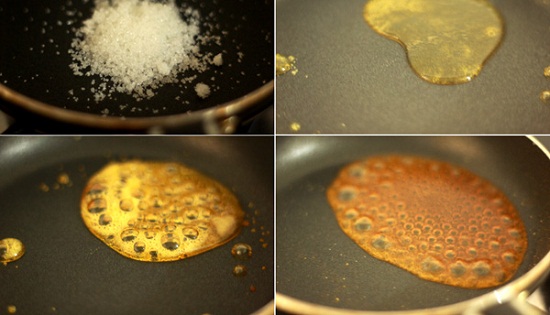 Bước 1:Cho đường vào chảo đun nóng lên cho đến khi chuyển màu vàng nâu thì đổ thêm nước, đun sôi rồi đổ ra bát.